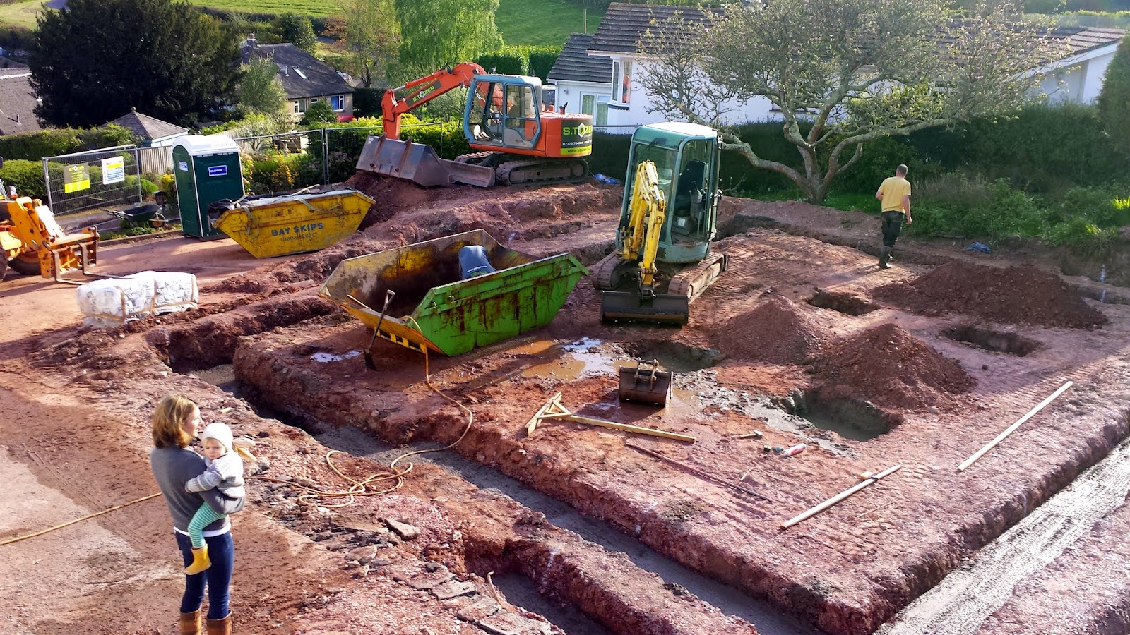 Then today they poured two loads of concrete into the trenches. The image below shows the full footprint with stepped trench foundations fully poured. In addition the small square holes in the middle of the footprint take the loadbearing posts of the timber frame.